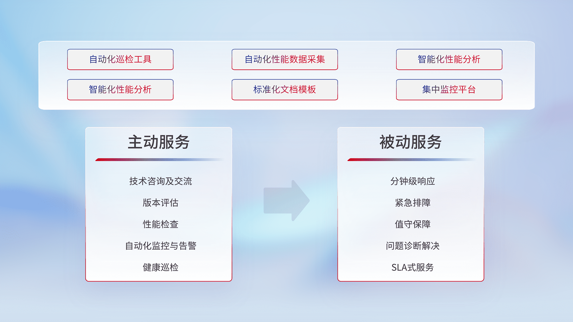 智能化工具和标准化文档,,,保障服务质量,,,提供主动服务(包含技术咨询、、、、版本评估、、性能检查、、、、自动化监控与告警、、、、健康巡检)和被动服务包含(分钟级响应、、紧急排障、、、值守保障、、、问题诊断解决、、、SLA服务)。。。